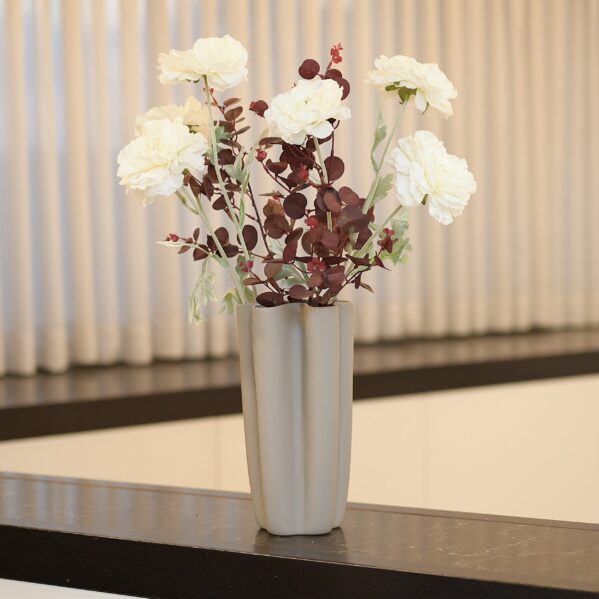 Inside, crisp white flowers are balanced by deep, reddish leaves that add a sophisticated pop of warmth. This "Sienna" palette creates a striking contrast against the neutral sand ceramic, making it a perfect statement piece for a bright kitchen, a console table, or an airy office.
