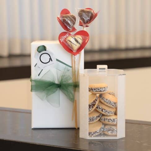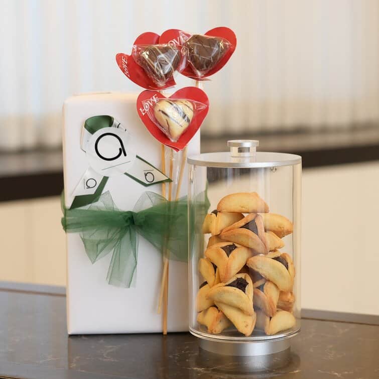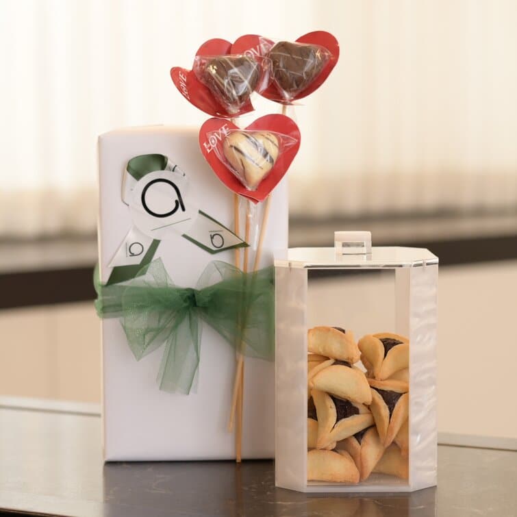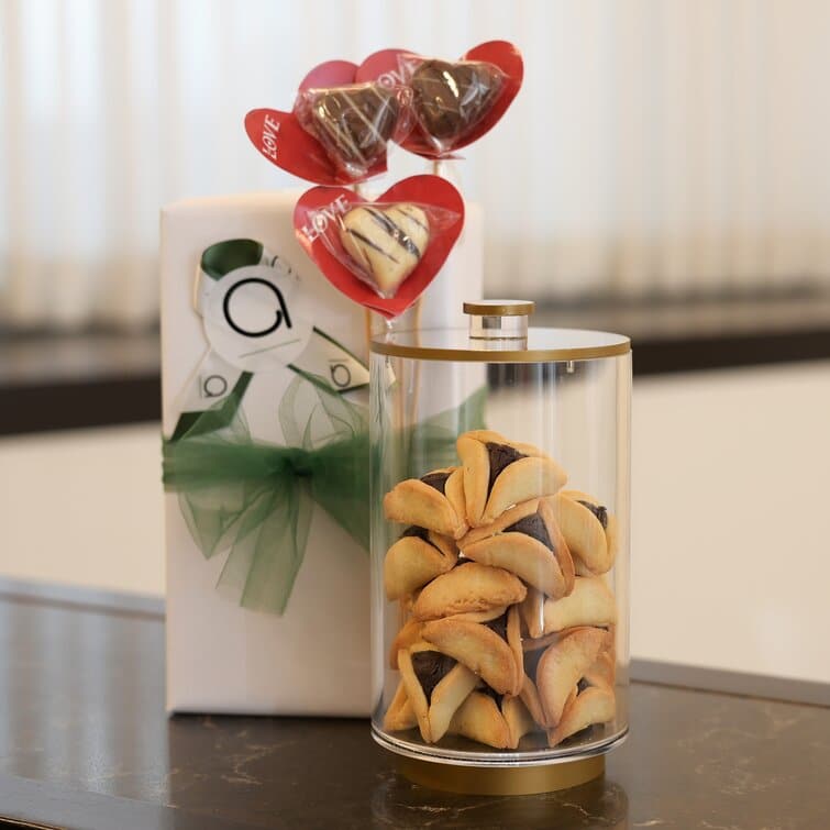 Mishloach Manos | Silver Cookie Jar with Hamentashen & 3 Chocolate Hearts