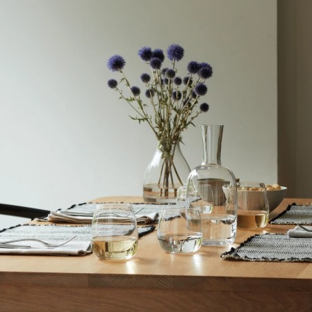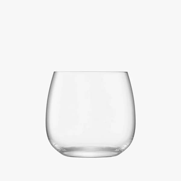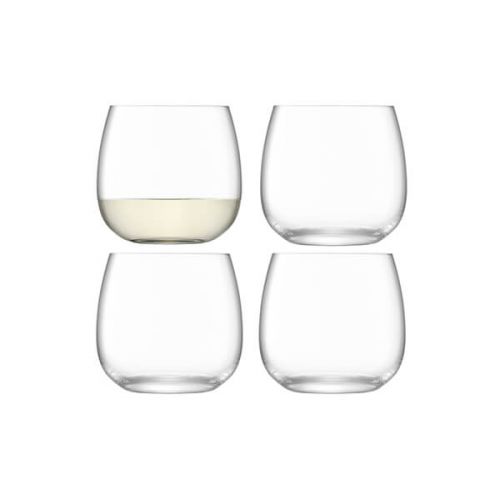 Set of four stemless glasses with fine walls and a curved shape. A versatile shape designed for wine, cocktails and water. Made from lead-free crystalline glass for clarity and strength.