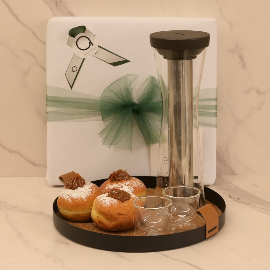 Chanukah Gift Package | Coffee Tray, Cold Brew Coffee Carafe, 2 Espresso Glasses with Doughnuts