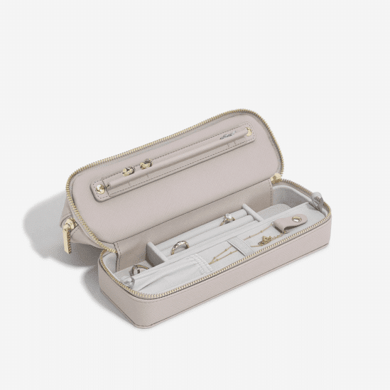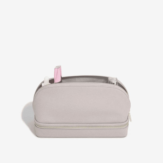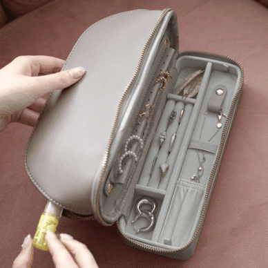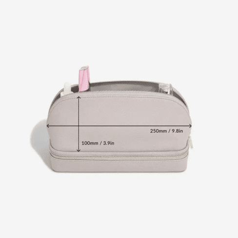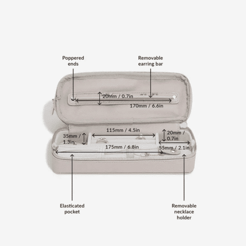 The Cosmetic and Jewlery Bag is a 2-in-1 storage bag featuring two separate sections for keeping your makeup and jewelry neatly organized. The zipped compartment at the bottom has been designed to keep your jewelry secure, with a removable necklace section, ring roll, removable stud earring section and small sections for additional trinkets. The large top section can comfortably fit your makeup collection and includes a small pocket with a removable mirror for when you are on-the-go.