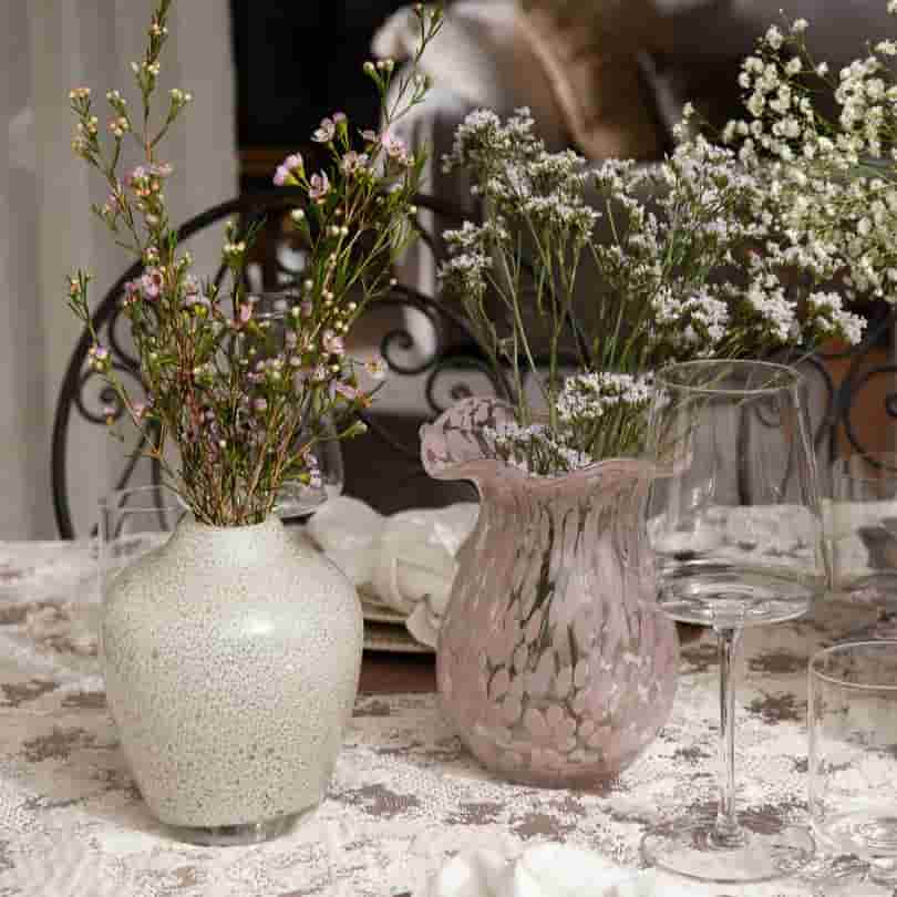 • The “Raindrop” Vase: The vessel features a stunning raised texture that mimics falling water, accented with swirls of soft lilac. It’s a piece that catches the light beautifully from every angle.