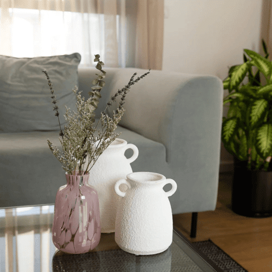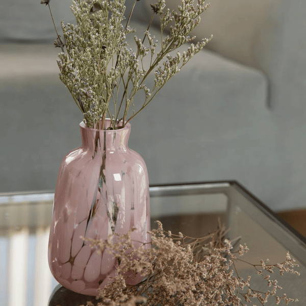 Package includes lilac splash vase by Casa Bella with a faux flower arrangement.