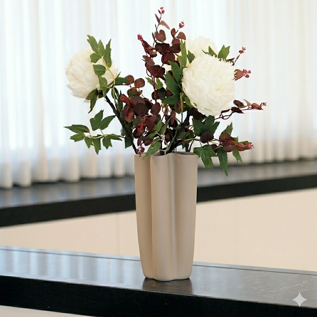 Elevate your space with Sandstone Bloom, an arrangement that celebrates organic form and rich color. This piece features the iconic Tulip vase by Cooee Design in a silken “Sand” finish. Its unique, petaled silhouette provides a soft, architectural foundation that feels modern yet natural.