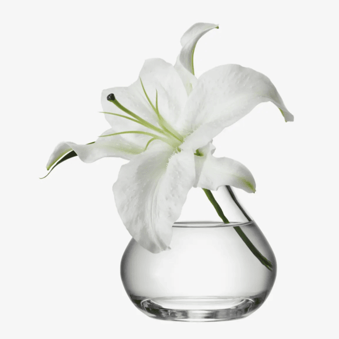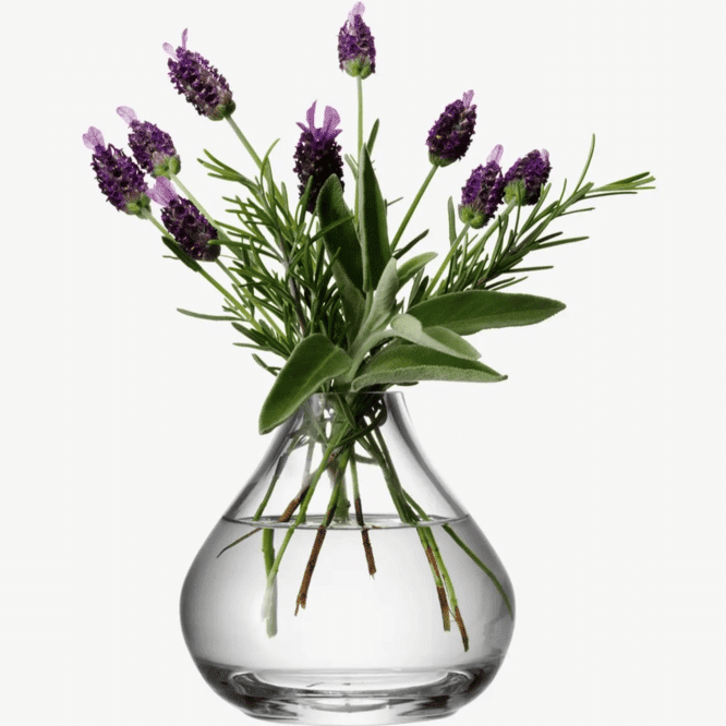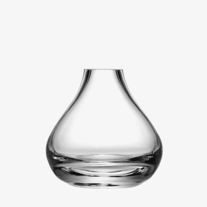 A small, teardrop-shaped mouth-blown vase. The narrow opening is designed for a single bud or sprig of foliage. Ideal for display on a shelf, mantlepiece, side table or a few across your dining room table.