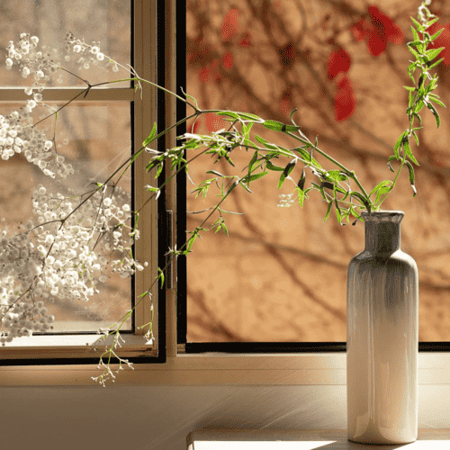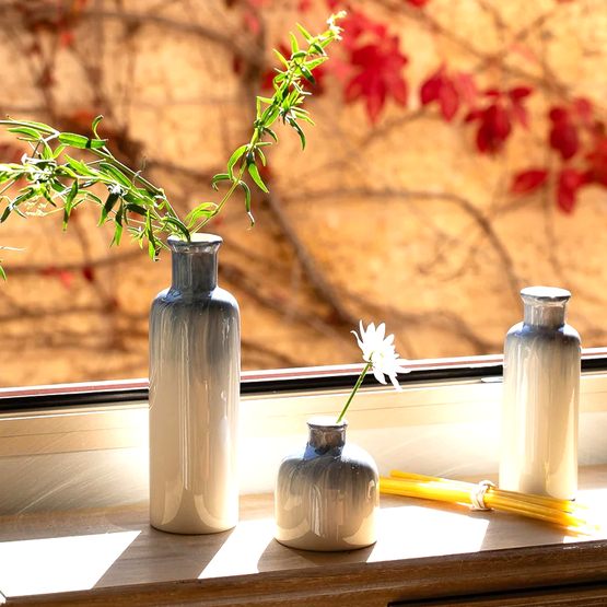 3 Ceramic Umbra Vases with faux flowers arrangement