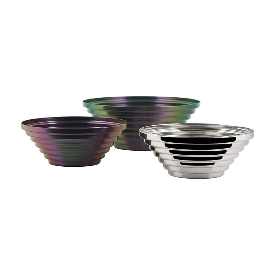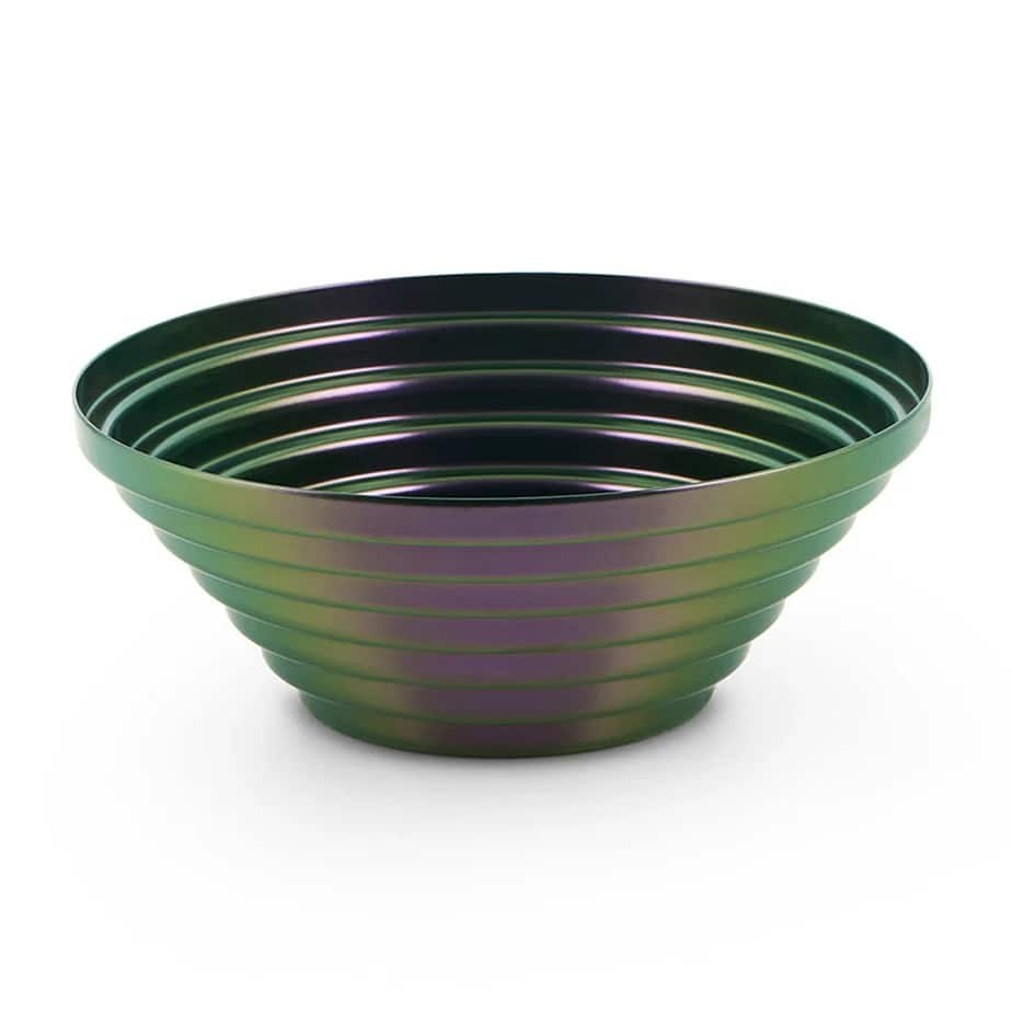 With its subtly reflective and mysteriously essential line, the Maya basket embodies a true graphic design masterpiece, masterfully evolved into three dimensions. Created in the 1970s by Giulio Confalonieri, its form was born from the precise cold forming of sheet steel. In this 20 cm diameter edition, the timeless elegance of the original polished stainless steel is joined by two new, complementary versions. These captivating new baskets shimmer with an iridescent quality, their colors gracefully shifting between vibrant green and deep violet.