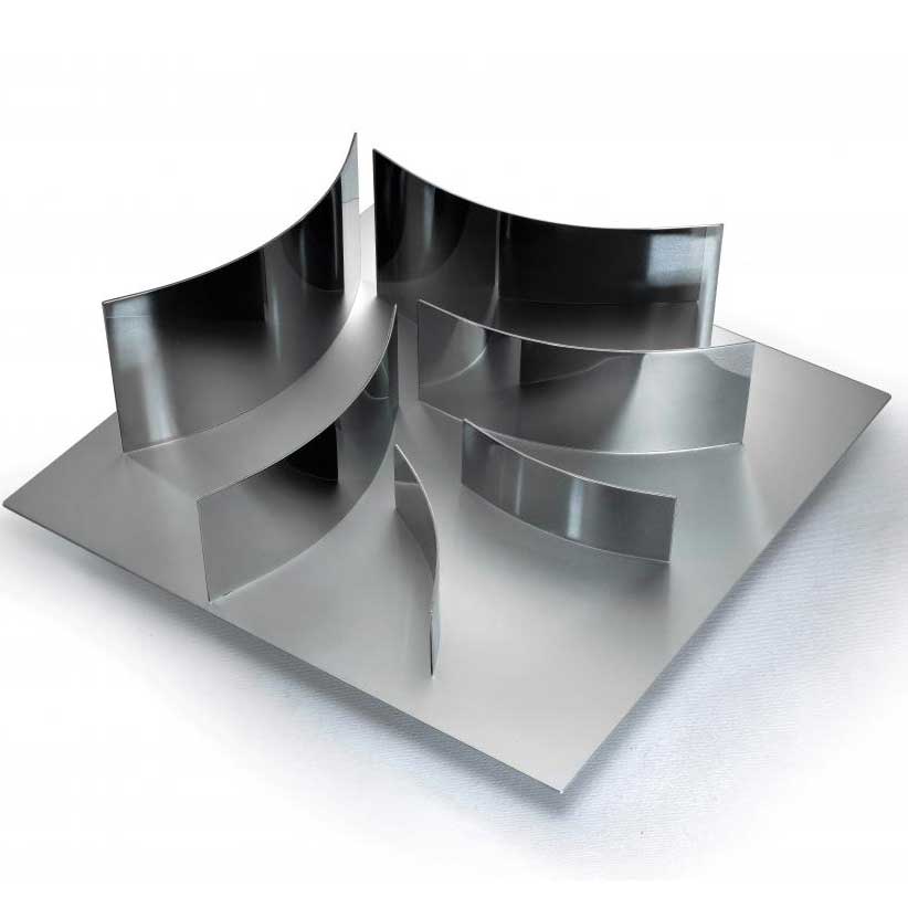 The tray is modular, and you choose how to arrange the waves. It can also be used as a decorative centerpiece with candles or fruit, or as a napkin holder. The base is created in easy to clean matte anodized aluminum.