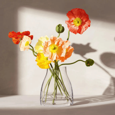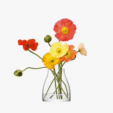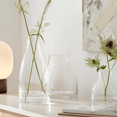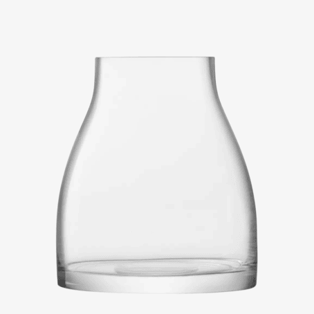 A mouth-blown glass vase with thick walls which curve to create the wide funnel-shaped neck. Designed for mixed bouquets or a few large flower heads.